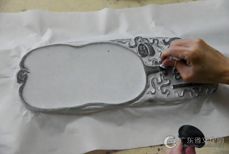 传拓技艺,是我国古代长期使用的一种行之有效的复制方法,肇庆地区的传拓技艺精于传拓端砚、碑石和摩崖石刻,能最大限度地采集原作文字、图案、设计、纹路等表面信息,且能更直观地展现原物的细微之处。所制拓片以岭南画派“写实”风格为主,结合中国画和西方画要点,墨色均匀并有较强层次感。