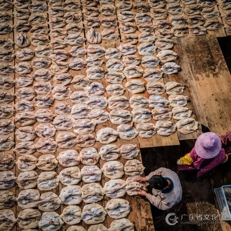 南雄板鸭在寒露至第二年立春前这一特定时段进行加工制作最佳,制作工艺包括选材、脱毛、脱水、开剖、腌制、定型、露晒、成品等多道工序。其中,食材选用南雄当地采取自由放养,未下过蛋或未换过毛的嫩麻鸭。制作板鸭要成鸭宰杀,充分倒挂放血后方可脱毛;然后剖开去内脏,将鸭肉悬挂至通风干燥处 60 分钟,让其滴干水分。砍断背部肋骨及胸骨,让其可以平整地铺在砧板上,并用预先炒干和冷凉的细盐干擦,将擦好盐及香料的板鸭放入缸内腌制 6 至 8小时,并摊开摆在竹挞上。在鸭子上加适当的重物,通过压力固定其形状,将腌制成型的板鸭用干净布擦去附着的杂物,再用“头酒”涂在板鸭上,以增加香味,处理好后拿去晒太阳,晚上让其在室外“打霜”,增加风味。将板鸭露晒至一定程度,最后再挂在屋檐下风干,待鸭子的表皮变成金黄色半透明状,板鸭即制作完成。