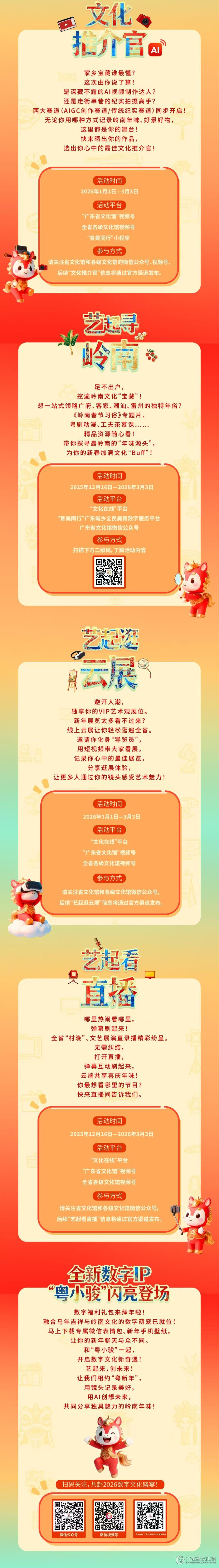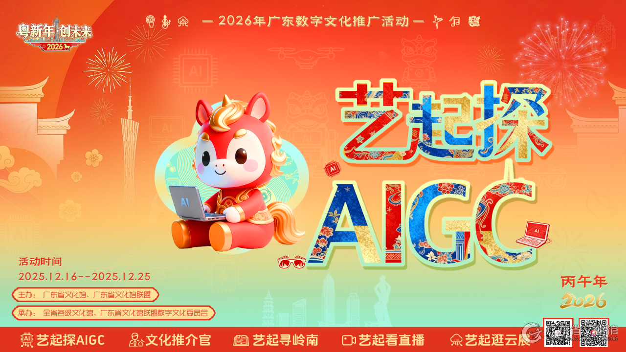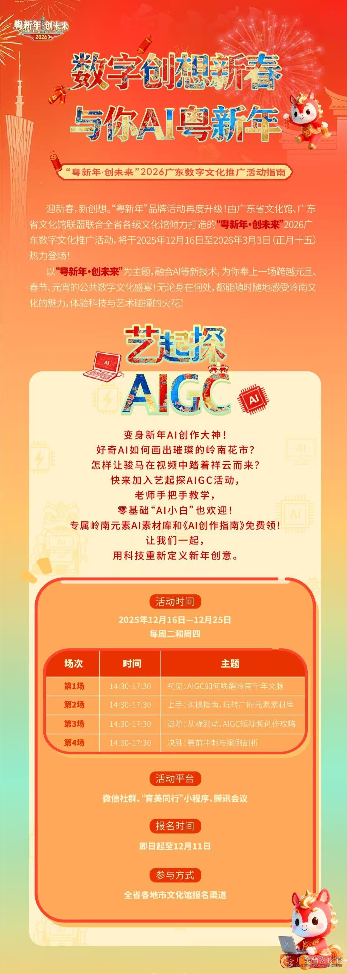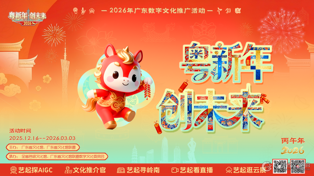 新年新气象,创意正当时!由广东省文化馆、广东省文化馆联盟携手全省各级文化馆共同推出的“粤新年·创未来”2026年广东数字文化推广活动,将于2025年12月16日至2026年3月3日(正月十五)热力全开!