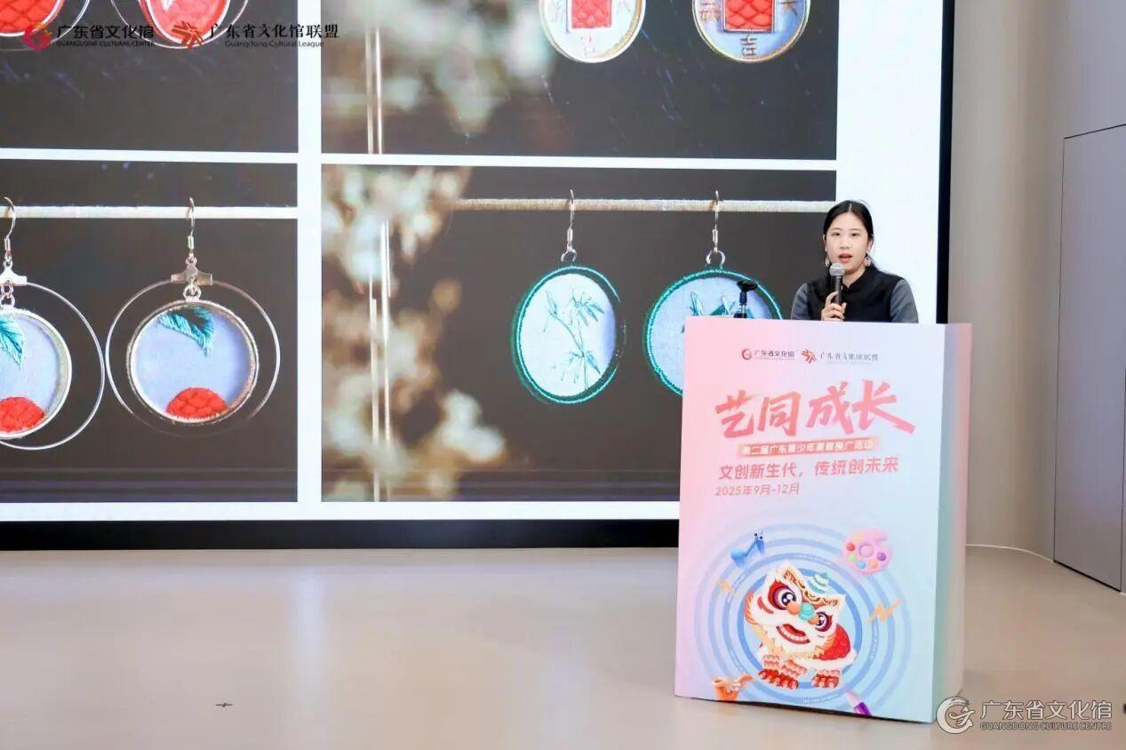 值得一提的是,在本次“艺同成长”活动的“创享之美”沙龙现场,何静仪与梁晓曼也作为分享嘉宾登上开放麦讲台,与来自全省的文化馆代表、教育工作者及青年学子交流互动。何静仪结合自己近十年“广彩进校园”的实践经验,讲述了如何将传统广彩技艺转化为青少年喜闻乐见的课程与文创;梁晓曼则分享了她在广绣教学中构建“全链条教育体系”的探索,以及如何通过题材创新与生活化设计,让刺绣艺术真正走进年轻一代的日常。她们的生动讲述,不仅展现了非遗传承中的青春力量,也为“馆校社协同美育”提供了鲜活的地方样本,进一步印证了“一彩一绣”在当代美育中的生命力与感染力。