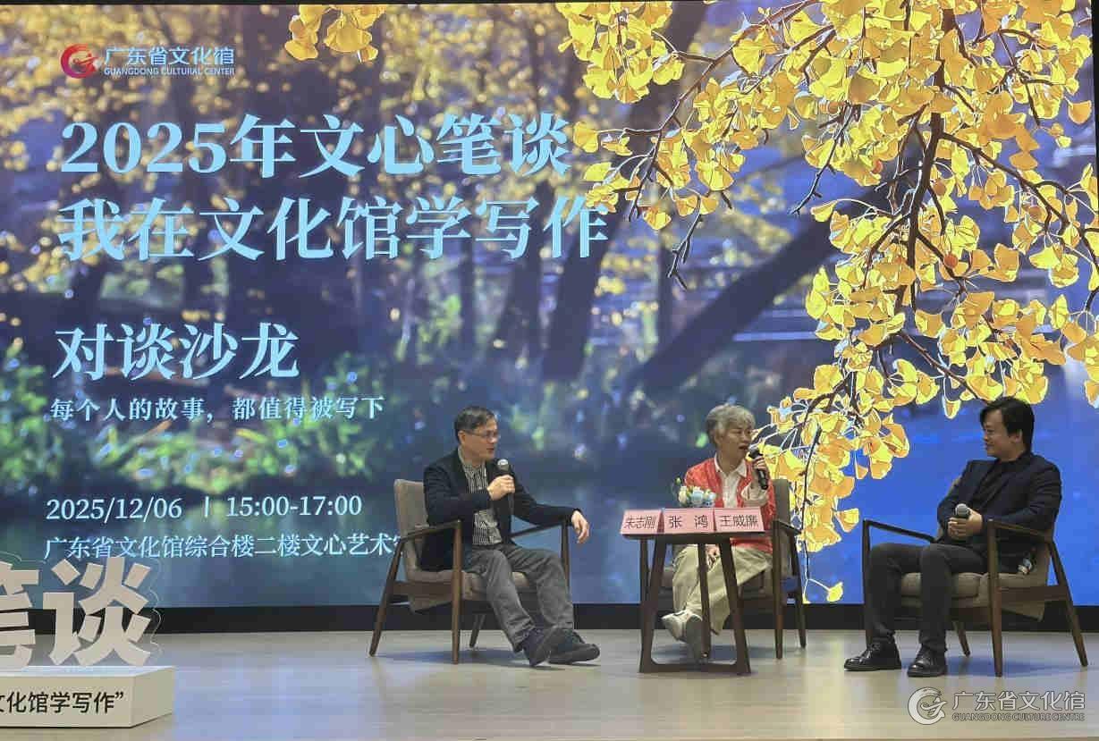 2025年12月6日下午,以“新大众文艺”为引领,“文心笔谈——我在文化馆学写作”对谈沙龙暨第三季结营仪式在广东省文化馆成功举办。活动特邀广州市作家协会副主席张鸿、广州市作家协会副主席王威廉、广东外语外贸大学创意写作中心执行主任朱志刚三位资深作家及学者,与60余名学员共聚广东省文化馆文心艺术空间,回顾本季“文心笔谈”学习历程,见证学员成长硕果,并围绕素人写作的现实路径与时代意义展开了深入交流。