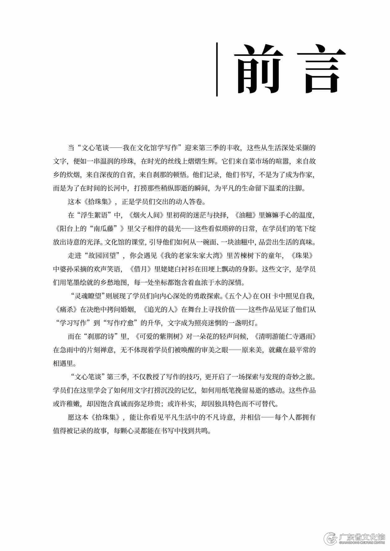 此外,广东省文化馆还将本季学员的优秀作品汇编成册,制作《拾珠集——2025“文心笔谈”学员优秀作品选辑》,既为学员们搭建才华展示平台,又集中展示2025年“文心笔谈”活动成果。这些凝聚着真诚与思考的习作,展现了素人写作者在文学道路上的真诚探索与不懈追求。