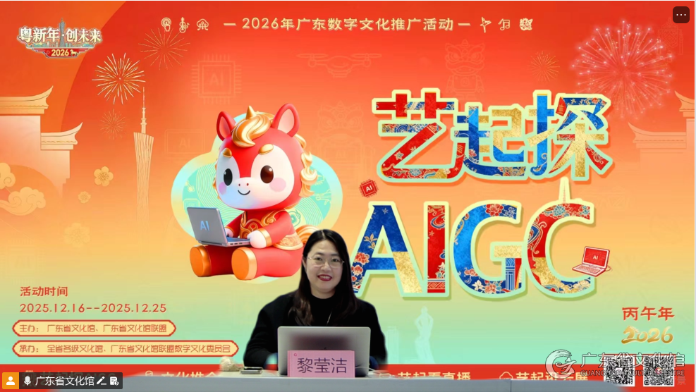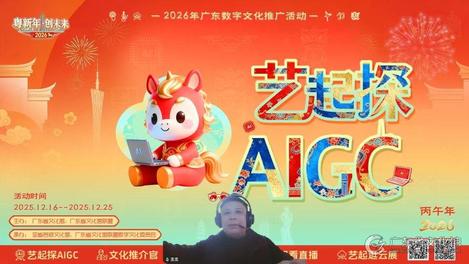 2025年12月25日,随着最后一节直播课程《决胜:赛前冲刺与案例剖析》顺利结束,由广东省文化馆、广东省文化馆联盟主办,全省各级文化馆联合承办的“粤新年·创未来”之“艺起探AIGC”线上培训圆满收官。本次培训自12月16日启动,为期两周,共开设25个班级,吸引了全省1123名学员参加,学员创作作品达815个。课程围绕岭南文化主题,从岭南文化绘画到短视频创作,专业老师手把手教学员使用多种AI工具进行创作,有效提升了学员的AIGC应用能力,激发了群众文化创新活力。