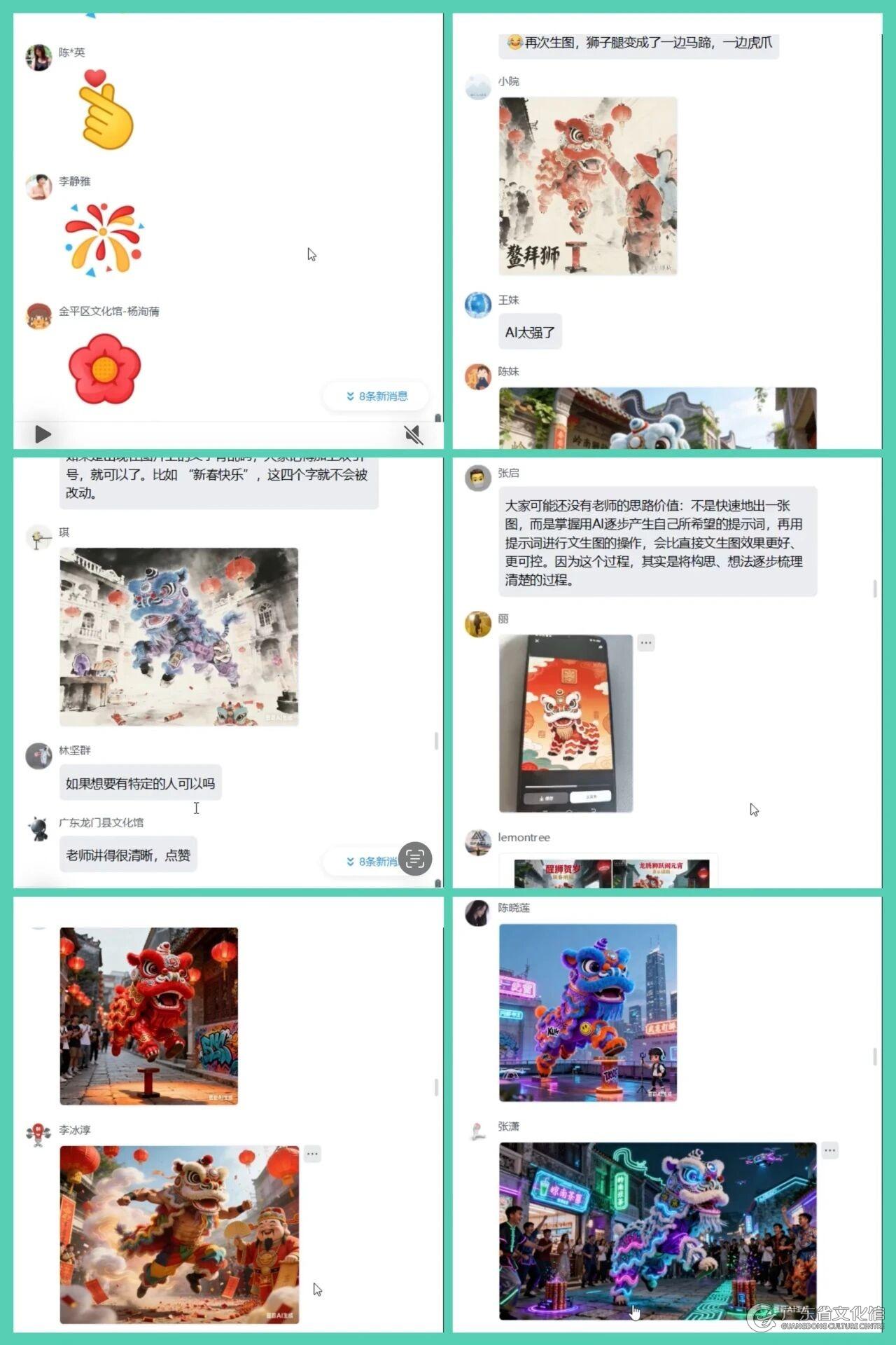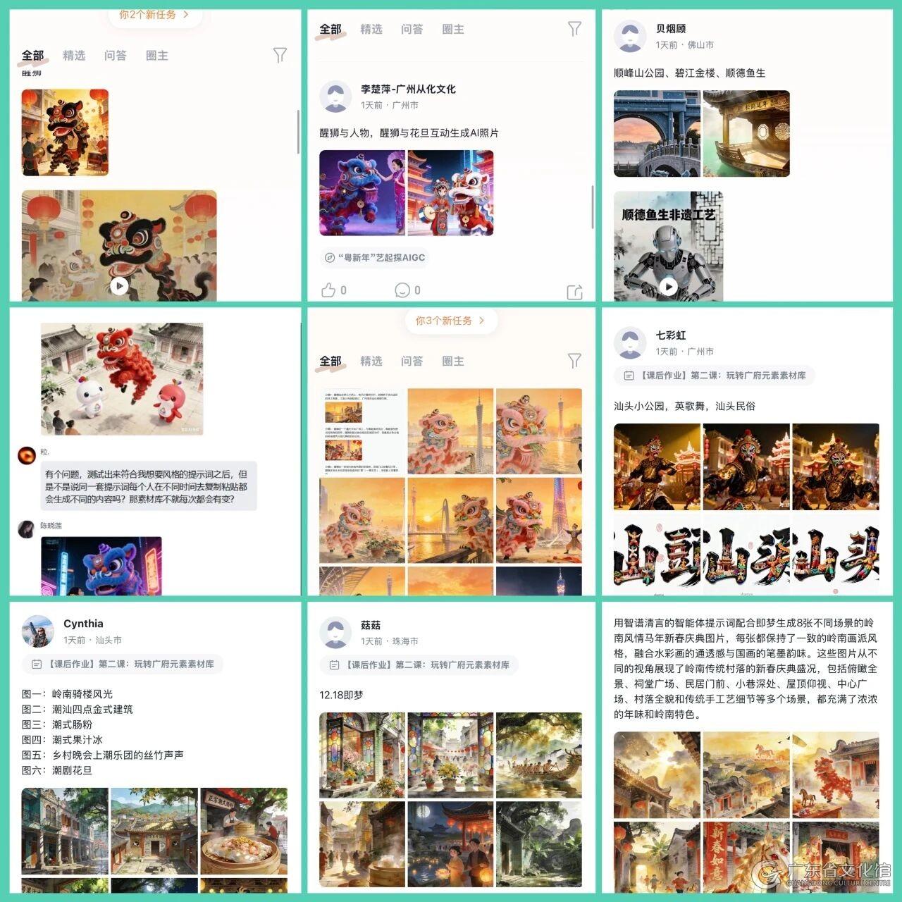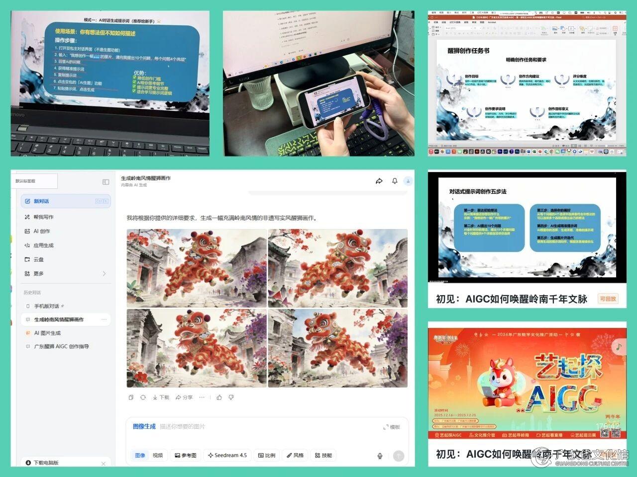 课程内容精准垂直,紧密围绕醒狮、粤剧、镬耳墙、迎春花市等特色岭南文化符号,沉淀了“岭南文化AIGC素材库”和专属提示词库,推动优秀传统文化资源的创造性转化。学员们迅速掌握了AI工具的应用技巧,并结合岭南文化元素创作出一批富有创意的数字作品。
