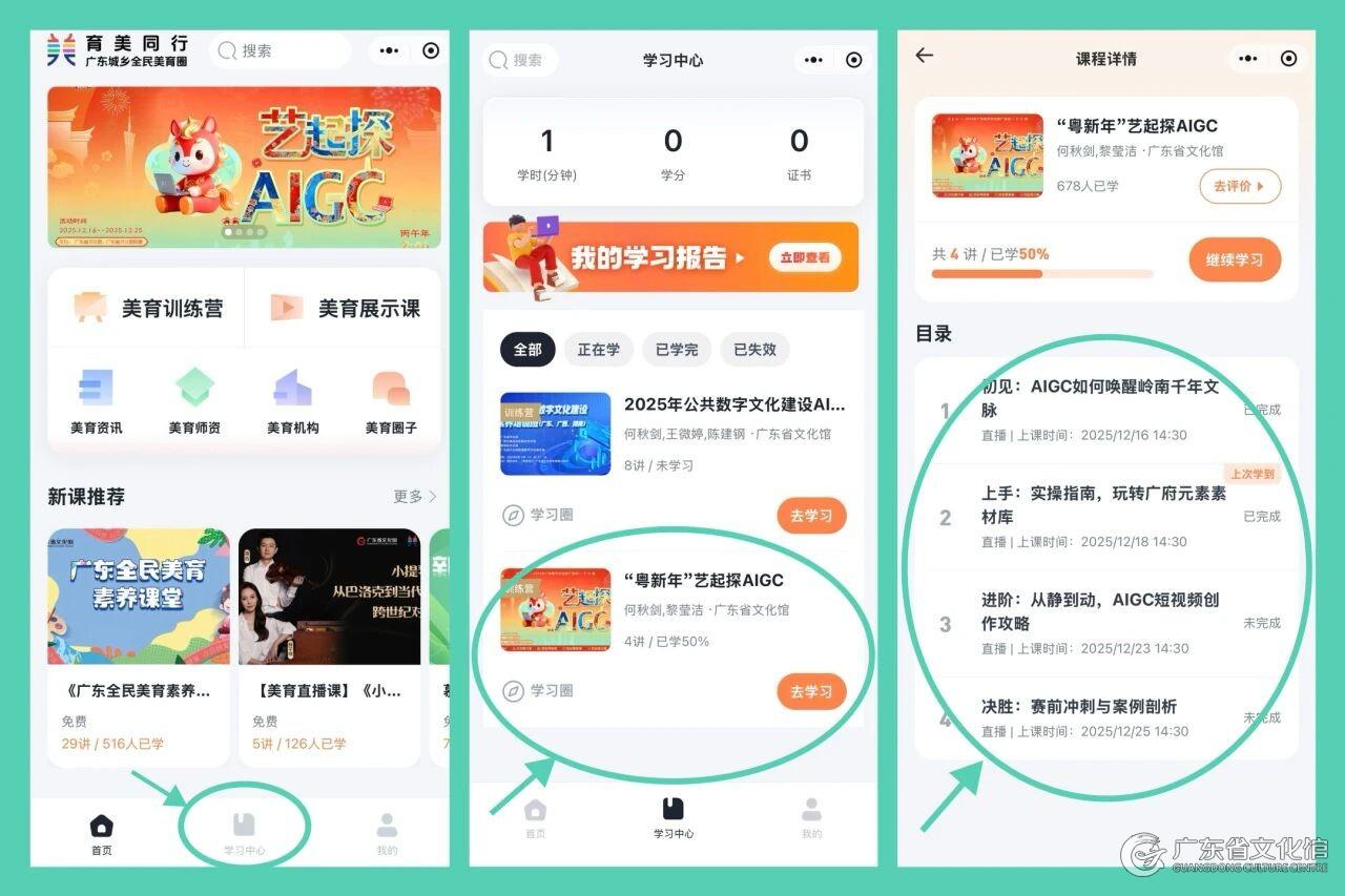 本次线上培训将直接衔接“粤新年·创未来”之“文化推介官”寻岭南AIGC短视频创作赛道,学员的优秀成果直接获得参赛参评资格,实现学员共学共创新模式。本次活动开拓了全民艺术普及培训闭环模式,学员从“作业打卡”到“参赛作品”风采展示,让普通大众的作品随时“上网”成景、“参赛”展风采。同时,学员完课即可获得完整创作资源包,包括录播课程、PPT讲义、关键词库等,真正实现从学习、实践到展示的无缝衔接。