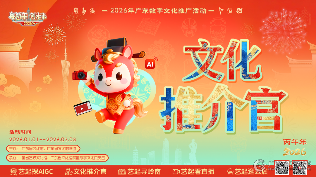 07 佛山市文化馆AI馆员“醒醒”沉浸式带你吃游佛山 文化推介官:佛山市文化馆 佛山市文化馆AI馆员“醒醒”沉浸式带你吃游佛山。在祖庙看镬耳屋脊上的百年陶塑,感受黄飞鸿与叶问的功夫之魂;走进南风古灶,触摸五百年不熄的窑火与石湾陶的温度。更有一盅两件、双皮奶、云吞面、陈村粉等地道非遗美食全程相伴。 报送单位:佛山市文化馆 08 岭南喜龙年 文化推介官:王启力 以“广东新年”为主线,用五幕叙事镜头把岭南文化、文农旅、美食与美景串成一条“喜运龙”。影片从永庆坊醒狮点睛“开门红”启幕,一路穿过花市、美食、非遗火龙,最终千架无人机拼出“新年快乐”,让红金炮屑、木棉花瓣、铁水火花、虾饺蒸汽层层叠加。 报送单位:惠州市文化馆 09 潮风粤韵 文化推介官:余梓琪 短片聚焦潮州山水与人文底蕴,以广济楼、牌坊街、非遗技艺与特色美食为叙事载体,用科技美学诠释地域魅力,以视听视角传递潮韵底蕴,全方位展现国家历史文化名城的独特风采与时代活力。 报送单位:潮州市文化馆 10 御马游顺德 文化推介官:陈兆贤 以马年为创作背景,通过充满童趣的想象,讲述了一位小女孩骑着纯真灵动的小白马,穿越顺德十大镇街,开启一场融合自然风光、历史人文与现代都市的奇幻之旅。 报送单位:佛山市顺德区文化艺术发展中心 从首批的“破壁出圈”到如今的“百花齐放”,文化推介官的舞台因每一个热爱岭南的你我而愈发精彩。无论是用AI重构传统,还是以纪实留存温度,你的创作都值得被全省看见!距参赛截止日期:2026年3月3日(星期二),快来成为下一个“文化推介官”,让全广东为你的创意喝彩! 投稿方式 方式一(视频号投稿) 在微信视频号发布作品,带上话题 #文化推介官#寻岭南AIGC创作#寻岭南传统纪实,并@广东省文化馆,定位你所在的城市。 寻岭南AIGC短视频创作赛道 寻岭南传统纪实短视频赛道 方式二(小程序投稿) 扫描下方二维码,进入“育美同行”小程序,在“文化推介官”短视频征集大赛活动页面直接上传视频。 扫码关注我们 获取最新赛事资讯与资源支持! 微信公众号 微信视频号
