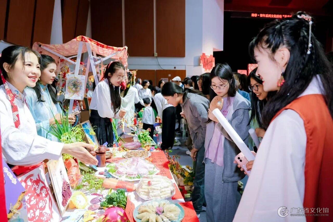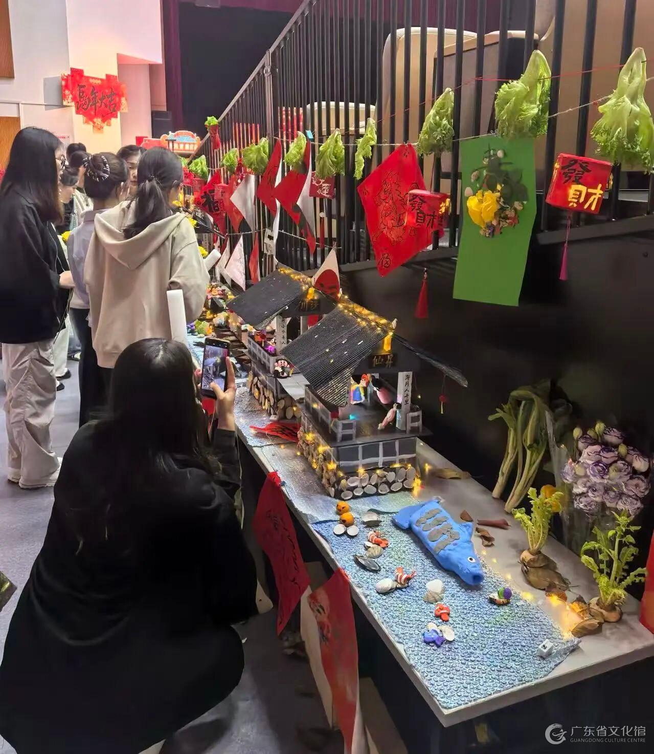 一进剧场,由广州市传承优秀文化促进会的青年们精心打造的客家、广府、潮汕三大主题展位——“源来不是客”“三江文脉,汇聚一心”“同源异彩 共创新程”像三幅徐徐展开的民俗画卷,吸引了观众们的目光。孩子们兴致盎然地观察纸皮做的“围屋”、锡纸做的“银饰”等展品,兴奋地跟家长们分享自己的发现。这些展位不仅用创意让废弃物“活”了起来,更通过“追根溯源”的主题设计,引导大家在互动中触摸岭南三大民系的文脉根基,让环保实践与文化传承在指尖碰撞出温暖的火花。