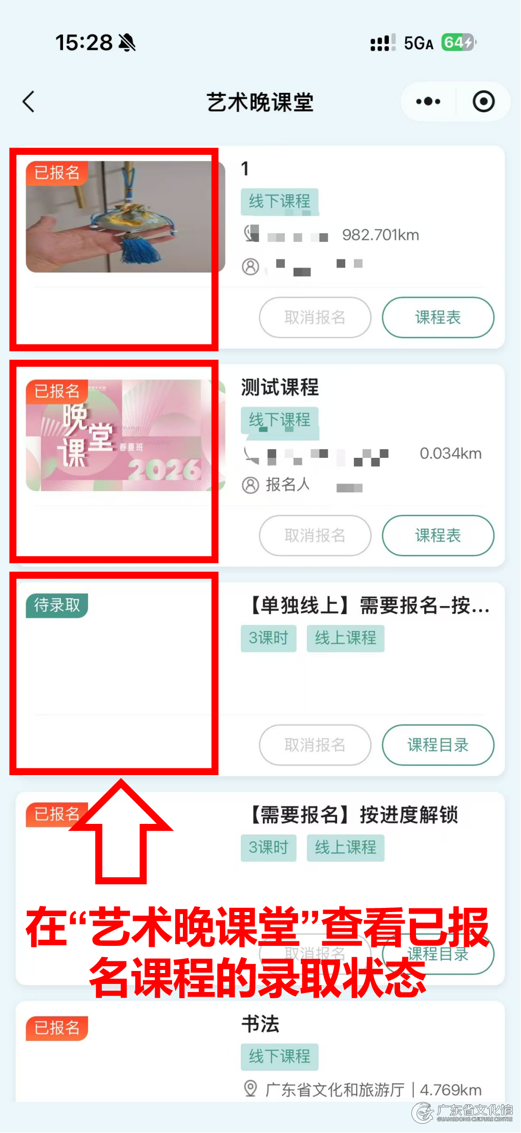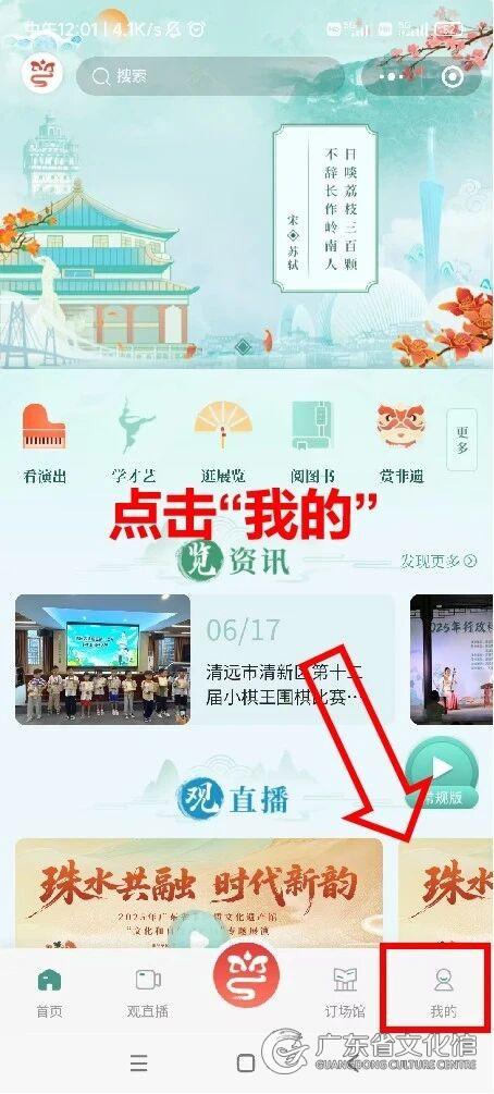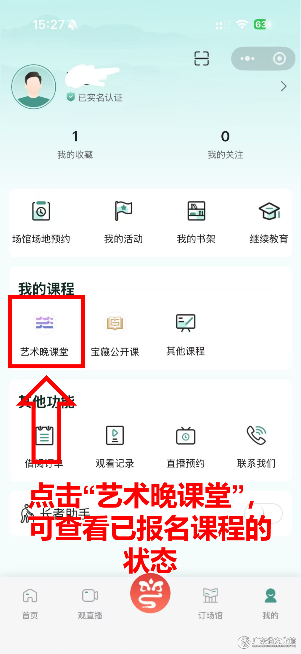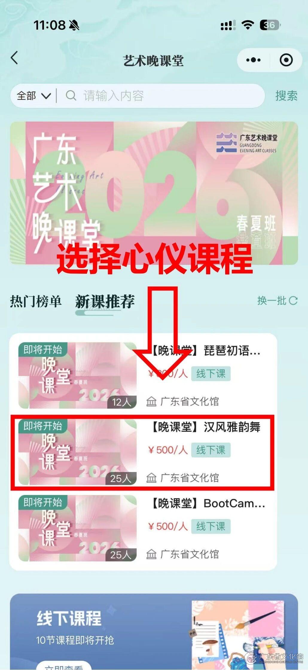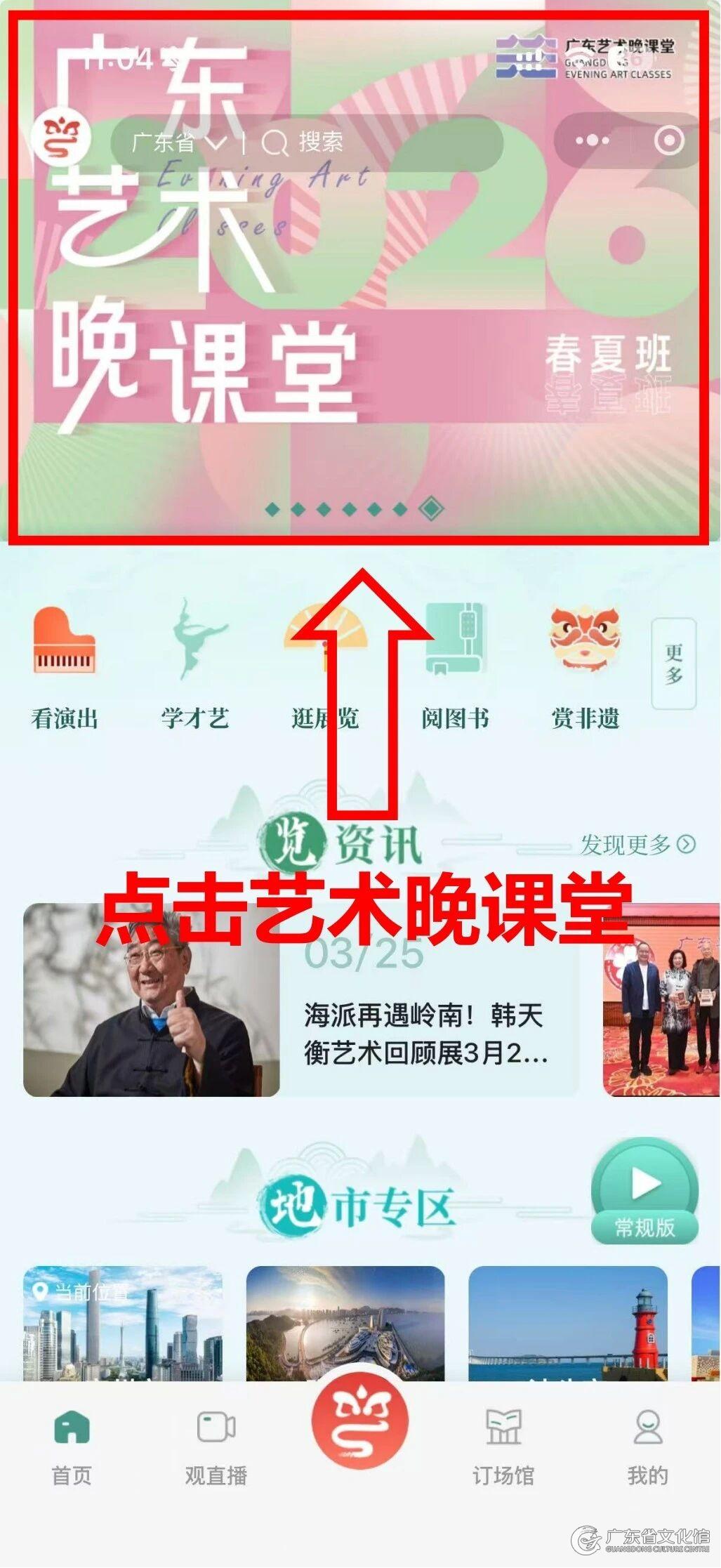 2.方式二:关注“广东省文化馆”微信公众号,点击底部菜单栏“微官网” -> “育美同行”专栏,搜索“晚课堂”相关课程。